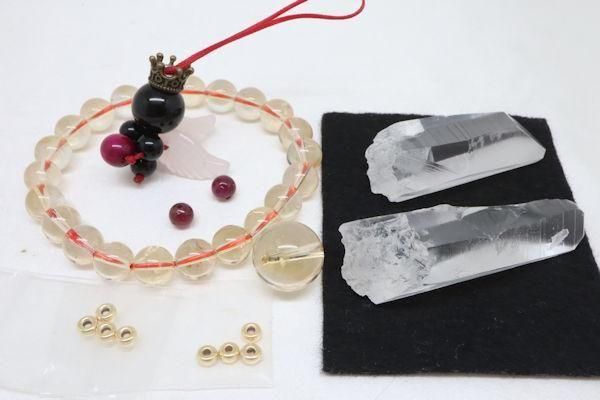 内容:14kgfパーツ×2、15mmシトリンビーズ、6mmルビー2粒セット、9mmシトリンブレスレット、レムリアンシード×2、モリオン天使ストラップ