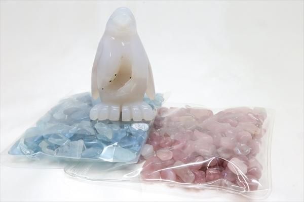 内容:アクアマリン細石、ディープローズクォーツ細石、トレジャー瑪瑙ペンギン