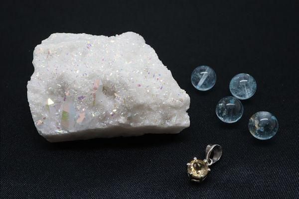 内容:9mmブルートパーズビーズ4個セット、シトリンペンダント、エンジェルオーラ原石