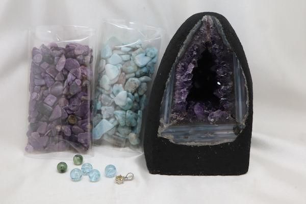 内容:ラリマー細石、チャロアイト細石、9mmブルートパーズビーズ4個セット、8mm日高翡翠ビーズ×2、シトリンペンダント、アメジストドーム